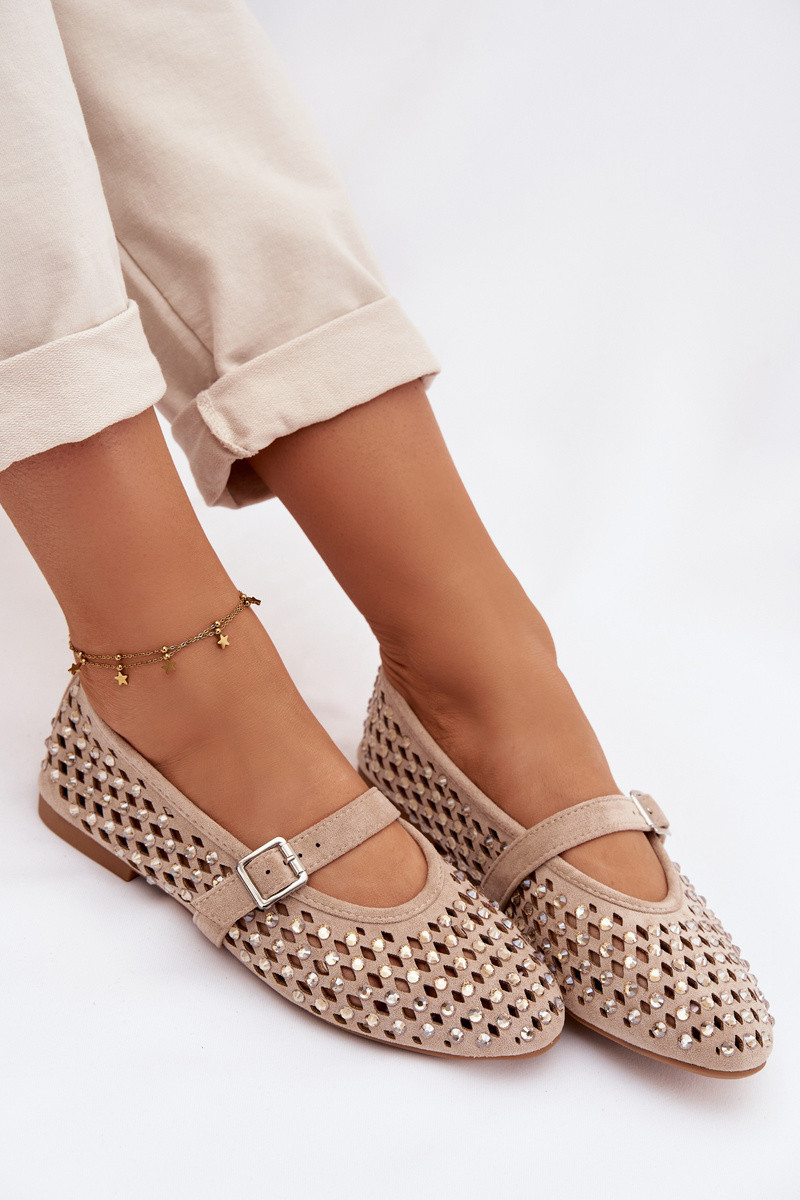 Dames ballerina's met ażurowe elementen, glinsterende gaatjes en bandjes in zandkleur Nilvessa