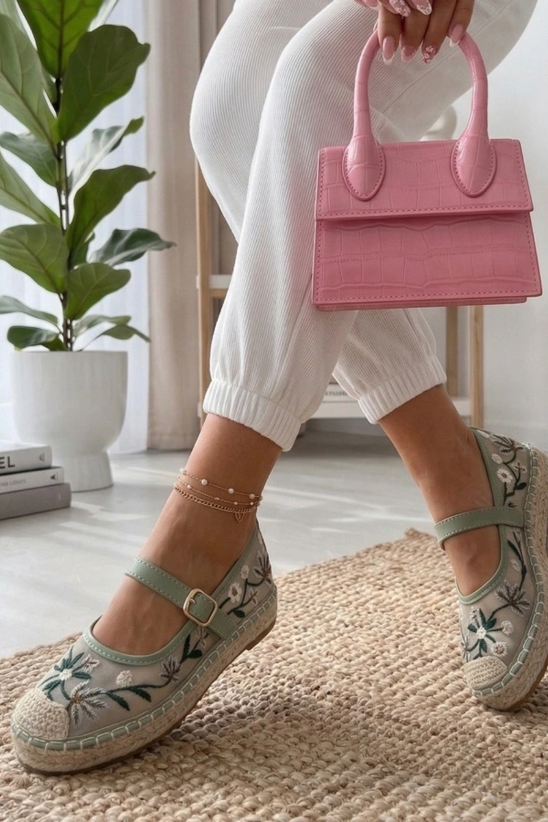 Groene espadrilles versierd met geborduurde bloemetjes Lucille
