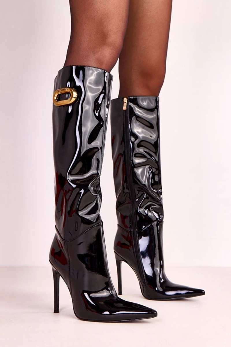 Zwarte lakleren lange laarzen met gouden versiering Herrera