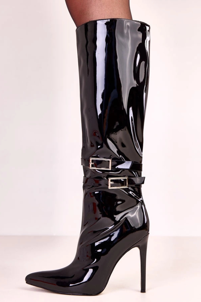 Zwarte lakleren lange laarzen met decoratieve gesp Asheris