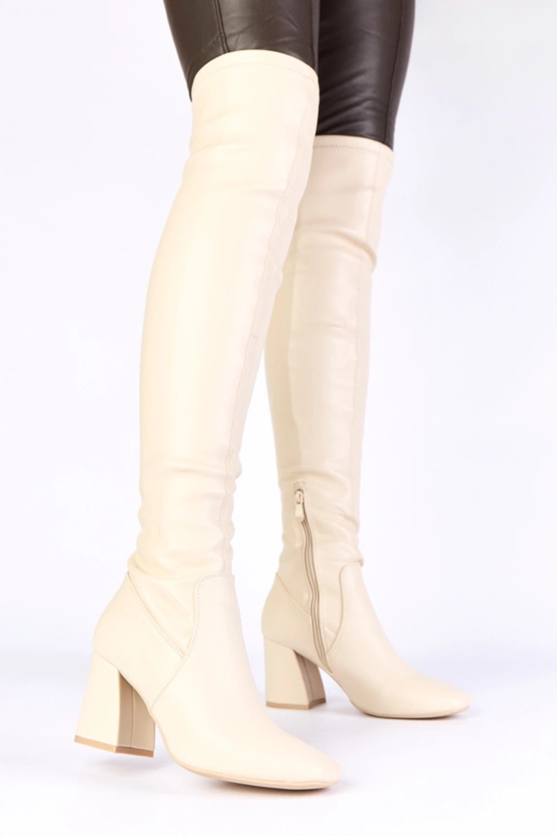 Zandkleurige lange laarzen boven de knie op een hak Louna