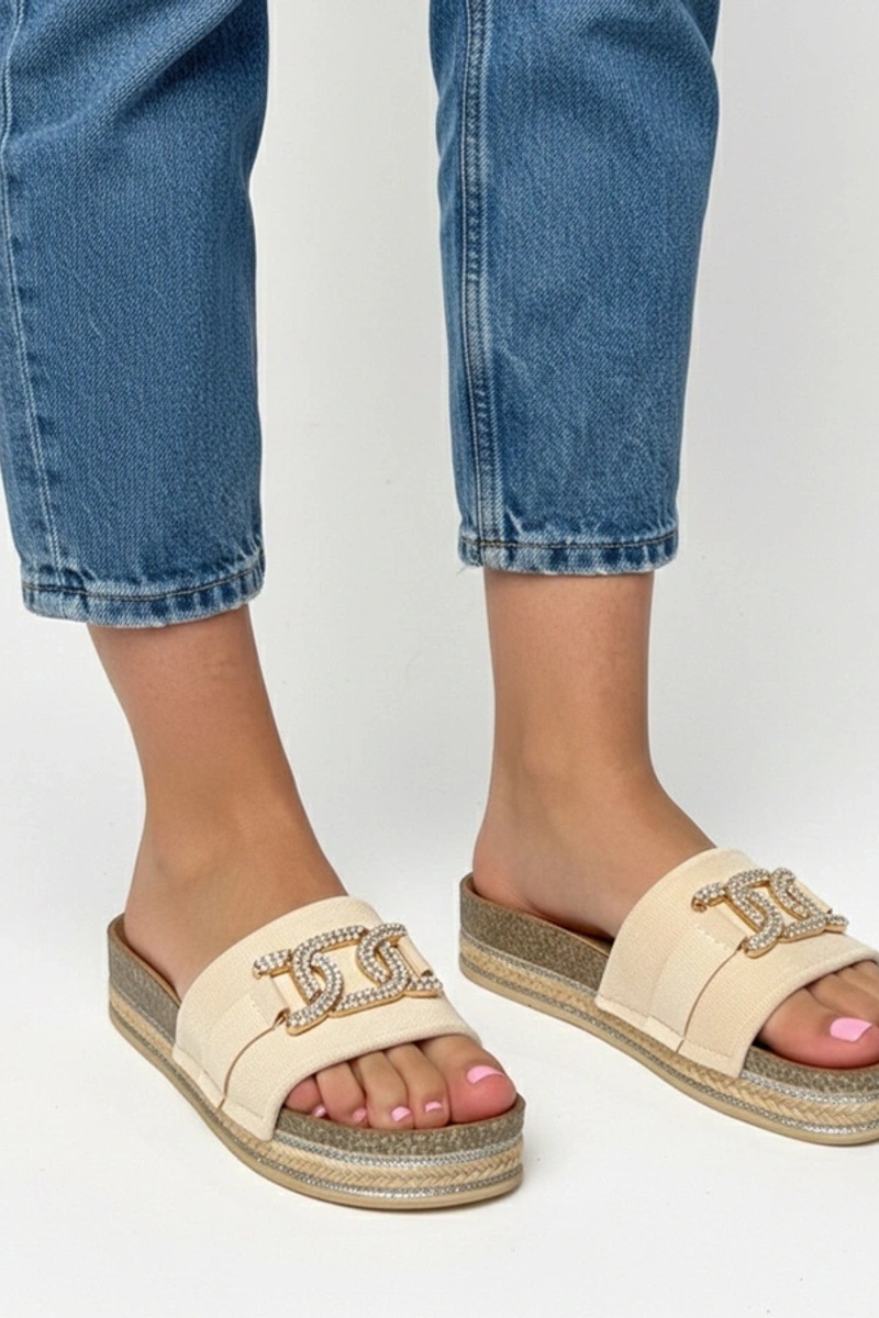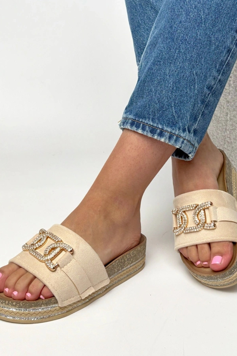 Zandkleurige slippers op een platform met glinsterende versieringen Faustine
