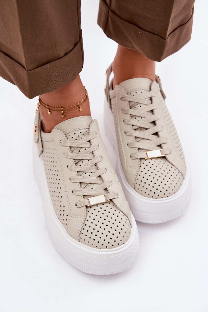 Leer met elementen van opengeInerkt Sneakers model schoenen Dames met platform met riemen Op Pięcie D&A LR61-7088 beige
