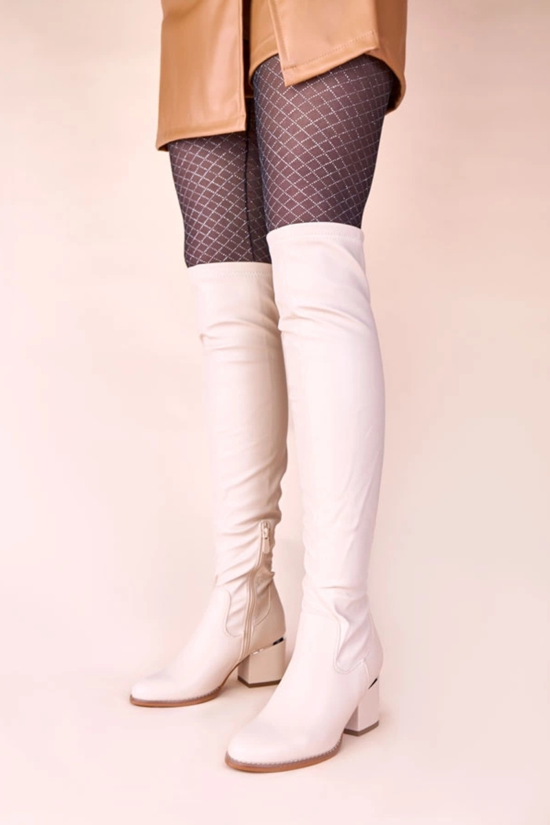 Sandkleurige lange laarzen boven de knie op een decoratieve hak Onka