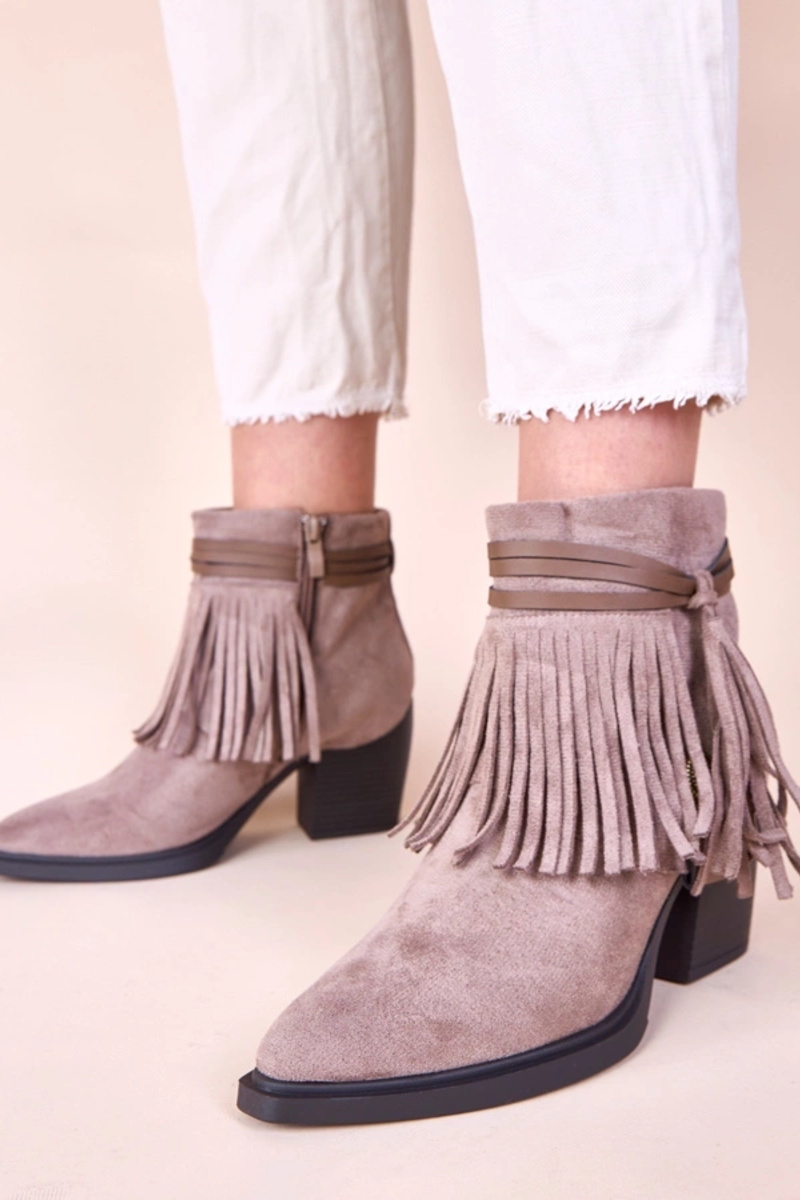 Donkerbeige enkellaarsjes op een hak met franjes Mulan