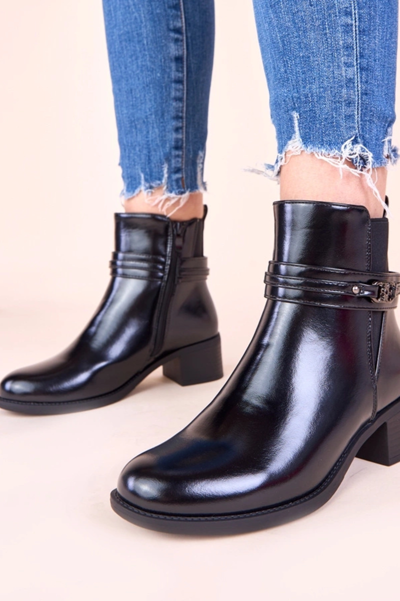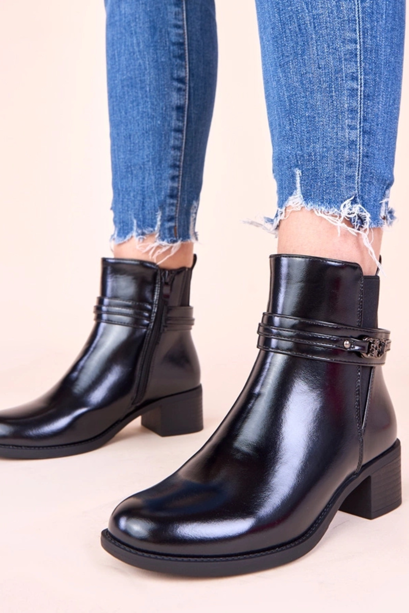Zwarte enkellaarsjes op een blokhak met decoratieve band Lilua