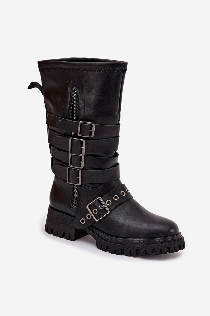 Zwarte gevoerde dames lange laarzen met bandjes en gespen „Ivaline"