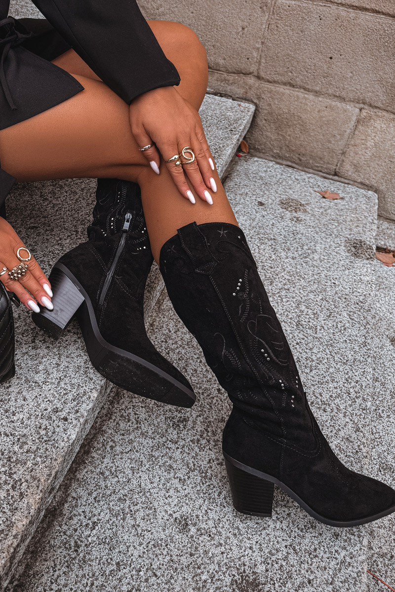 Dames cowboy lange laarzen met hak van kunstsuède in zwart Coretta