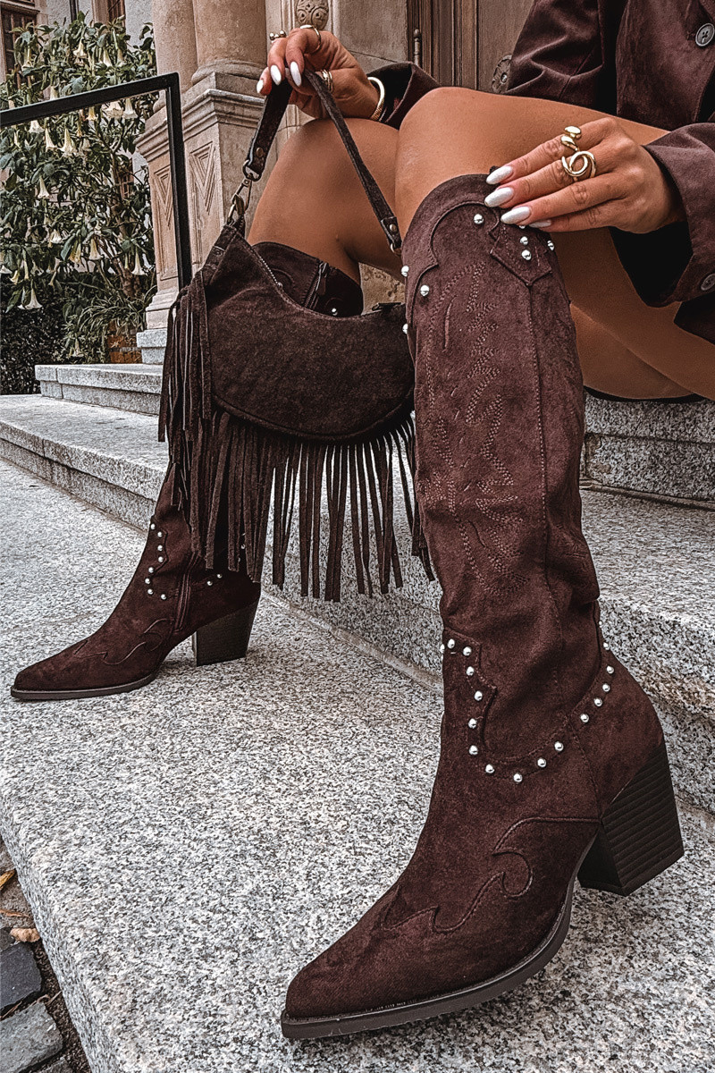 Dames lange laarzen in cowboystijl met decoratie en hakken, chocoladebruin Darella