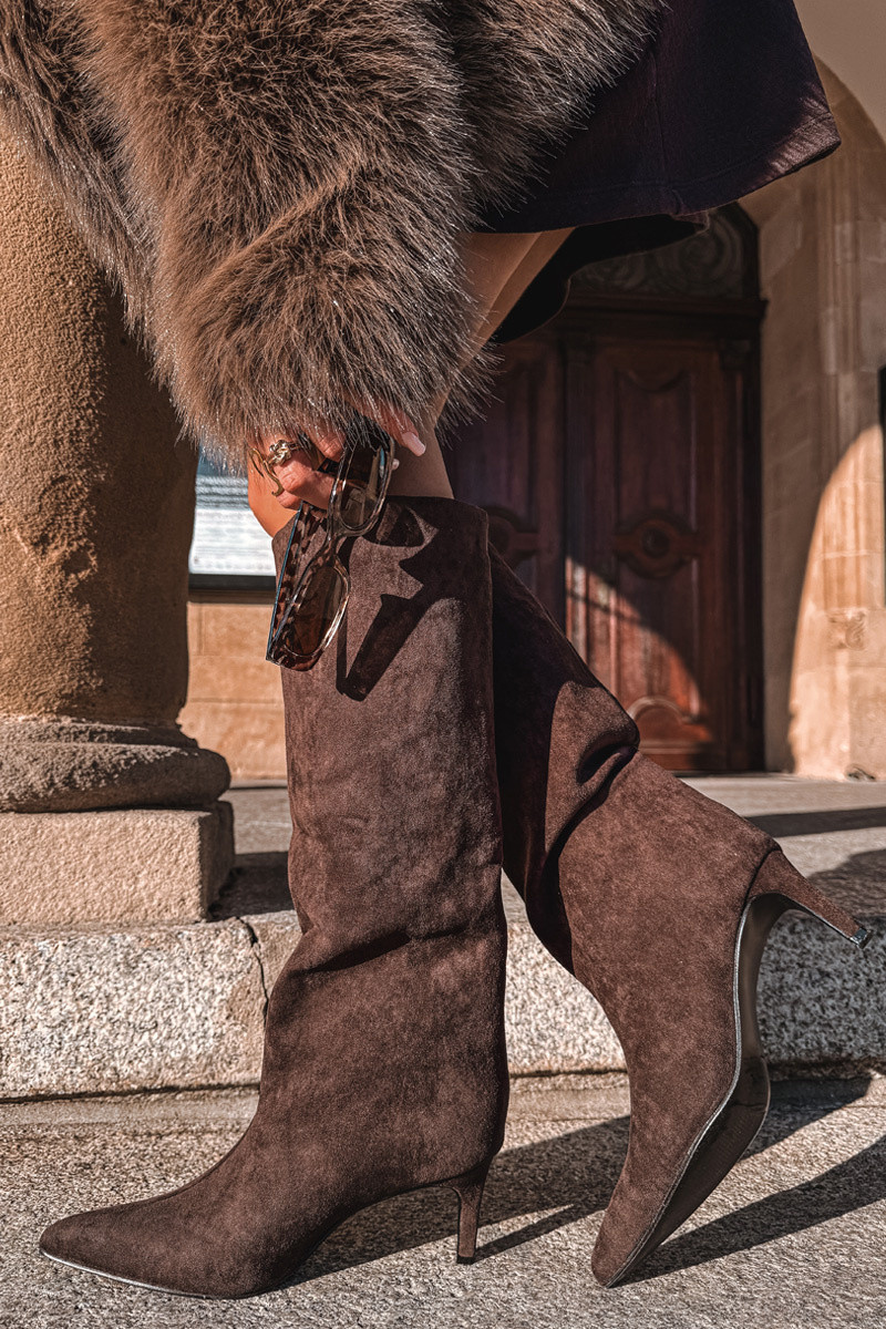 Dames lange laarzen van kunstsuède, instapmodel met dunne hakken, chocolade kleur Phelin