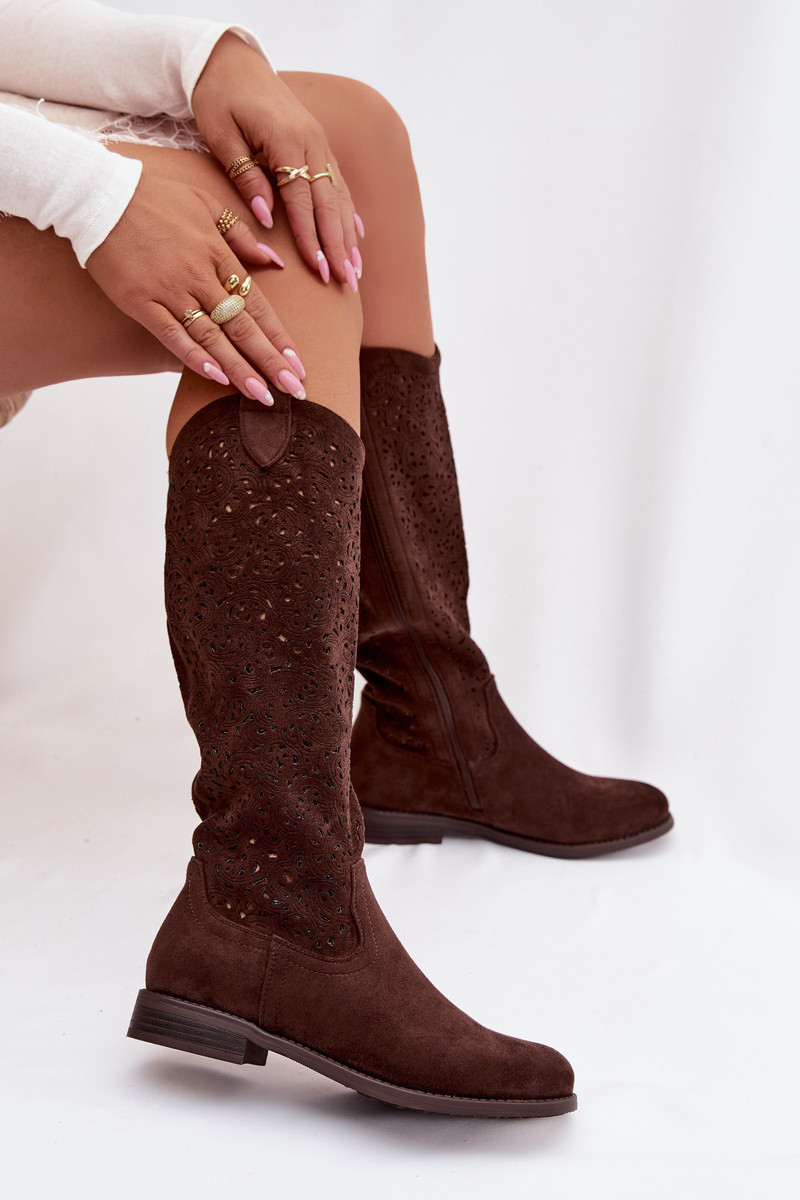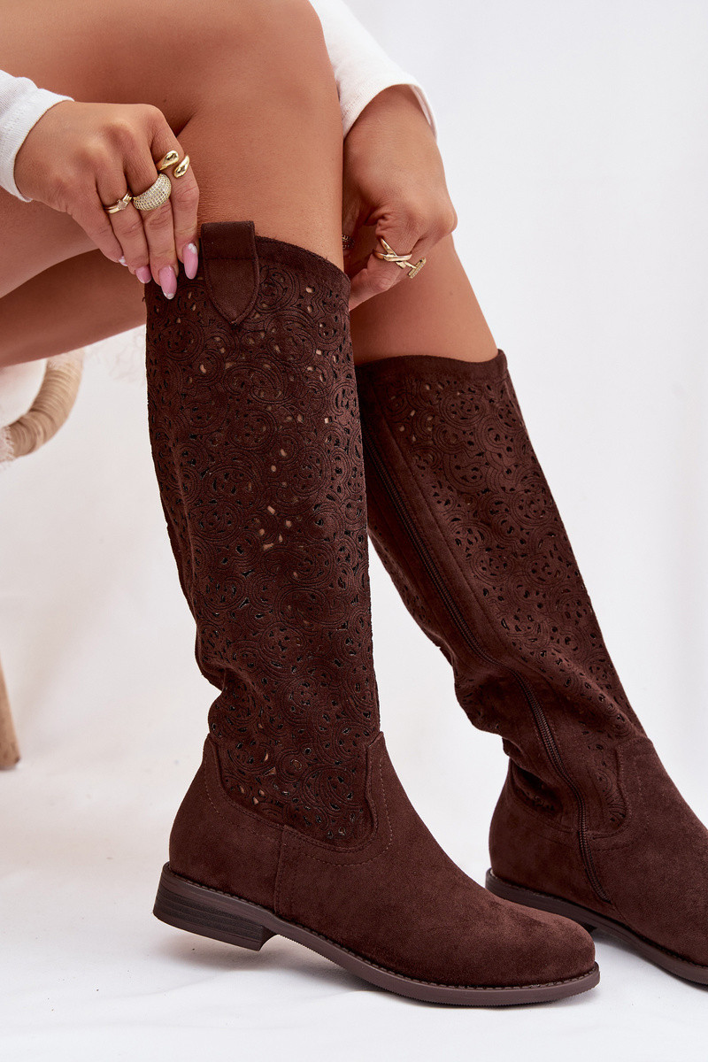 Dames knie laarzen met opengewerkte elementen en brede hakken S.Barski HY61-8023, chocolade kleur