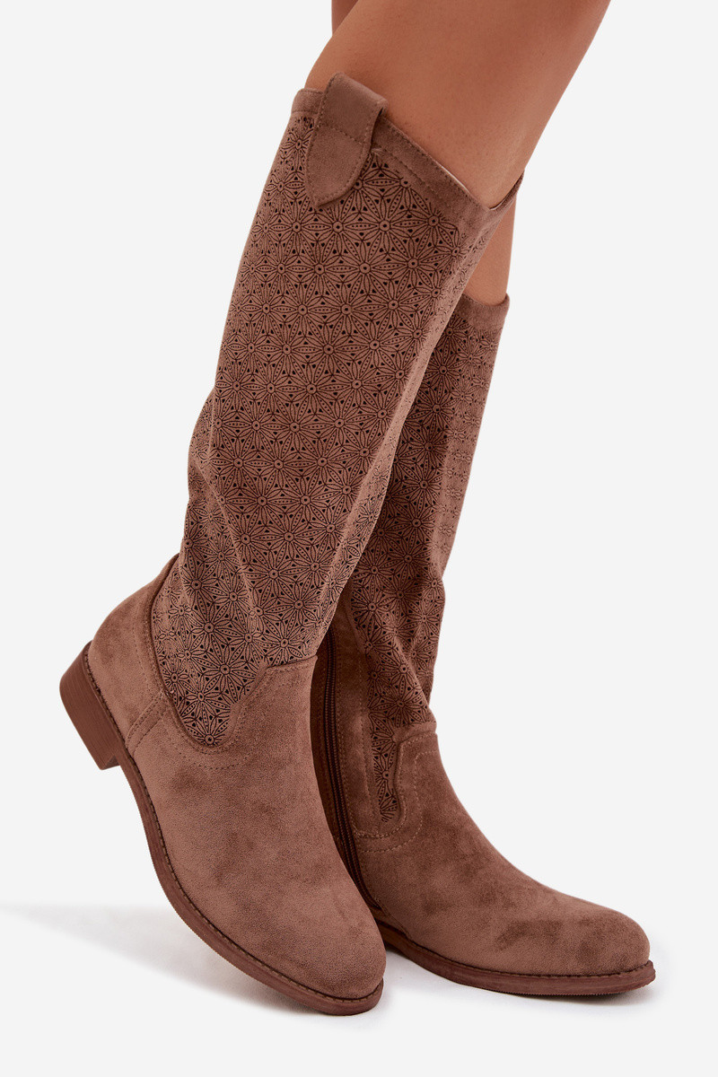 dameslaarzen met opengeInerkte elementen met brede hakken S.Barski HY61-8022 bruine kleur