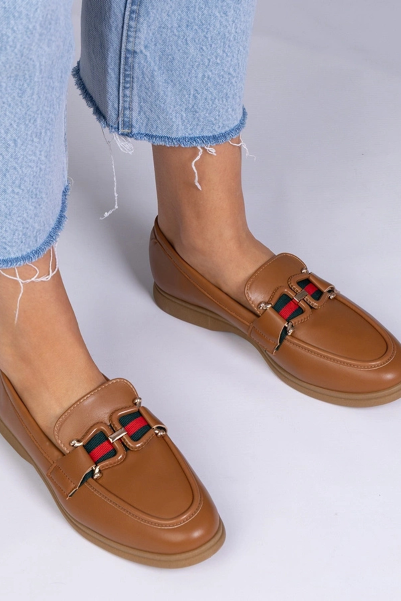 Zandkleurige mokassins van kunstleer met versiering, „Kalenda"
