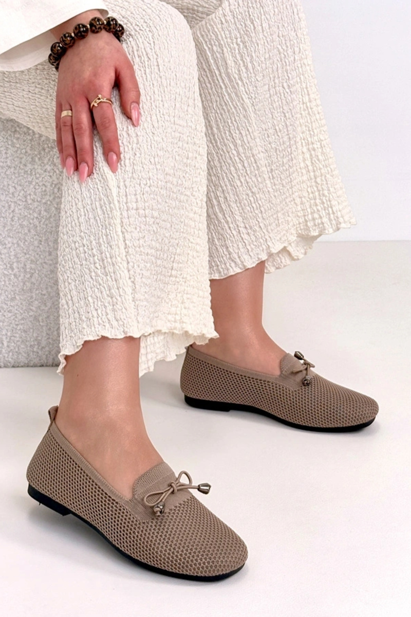 Donkerzandkleurige stoffen mocassins met strikje Aubrey