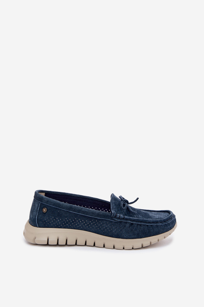 Donkerblauwe faux suede dames mocassins met strikken Vinceza 95401