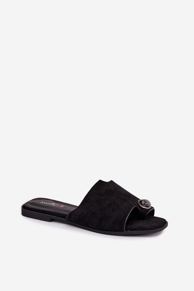 Dames lage slippers met luxe details van kunstsuède, zwarte kleur, Selavine