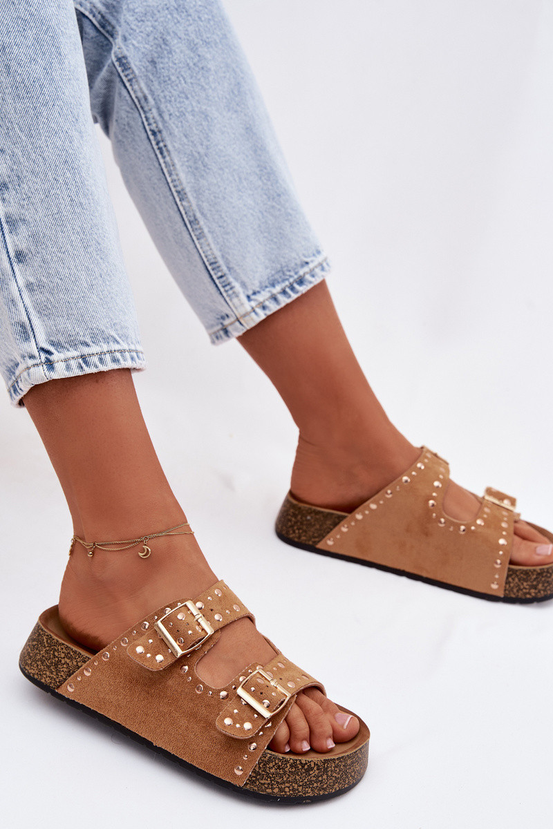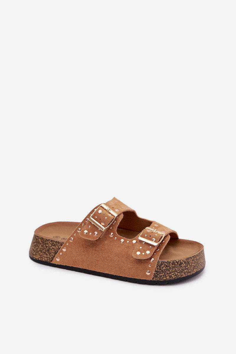Damespantoffels Ze gouden kleurmi met gespenmi En studs bruine kleur Tervina