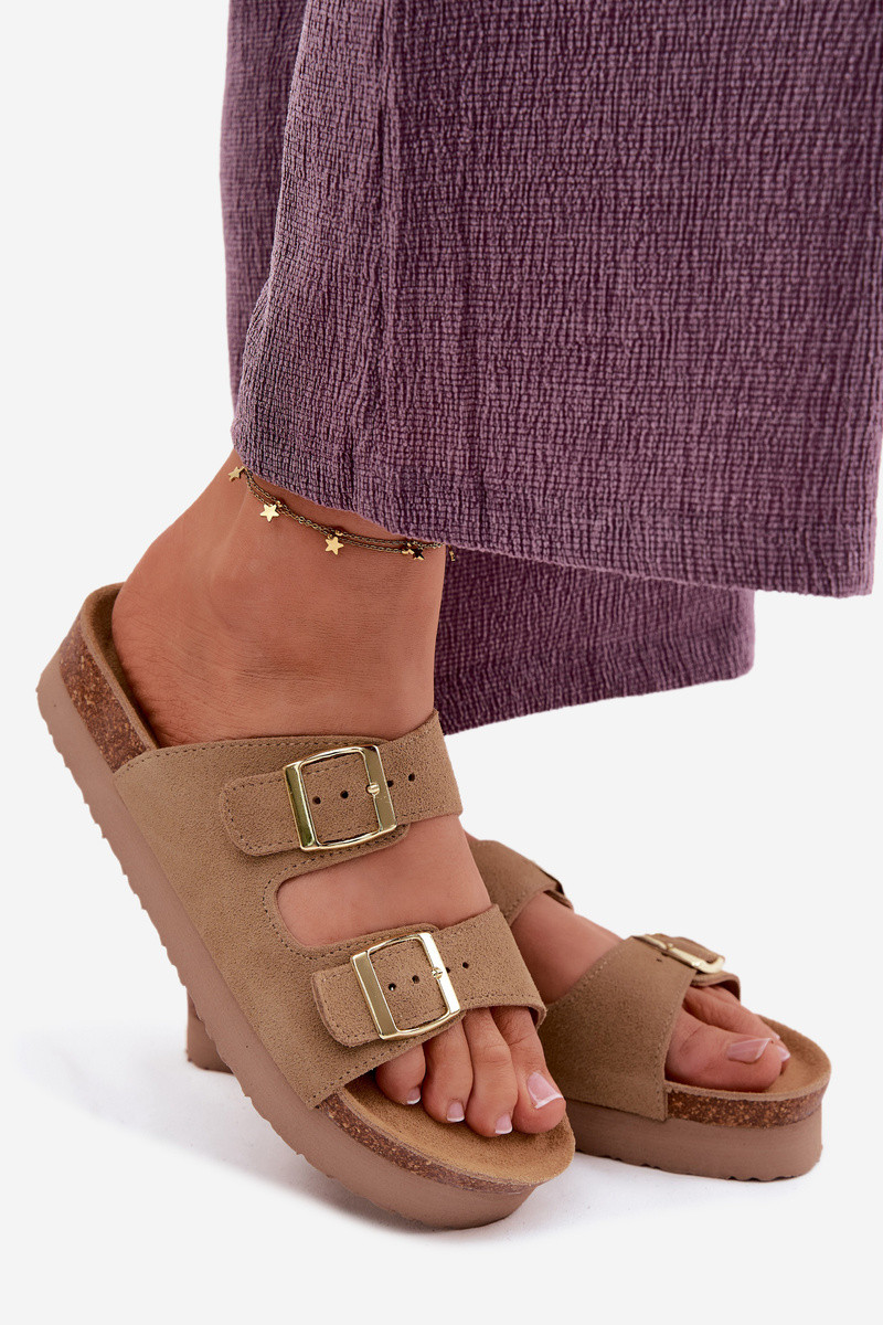 Leer Dames suède pantoffels met platform met gespen Vinceza 102657 beige