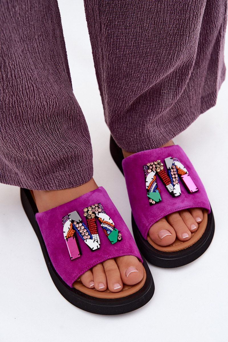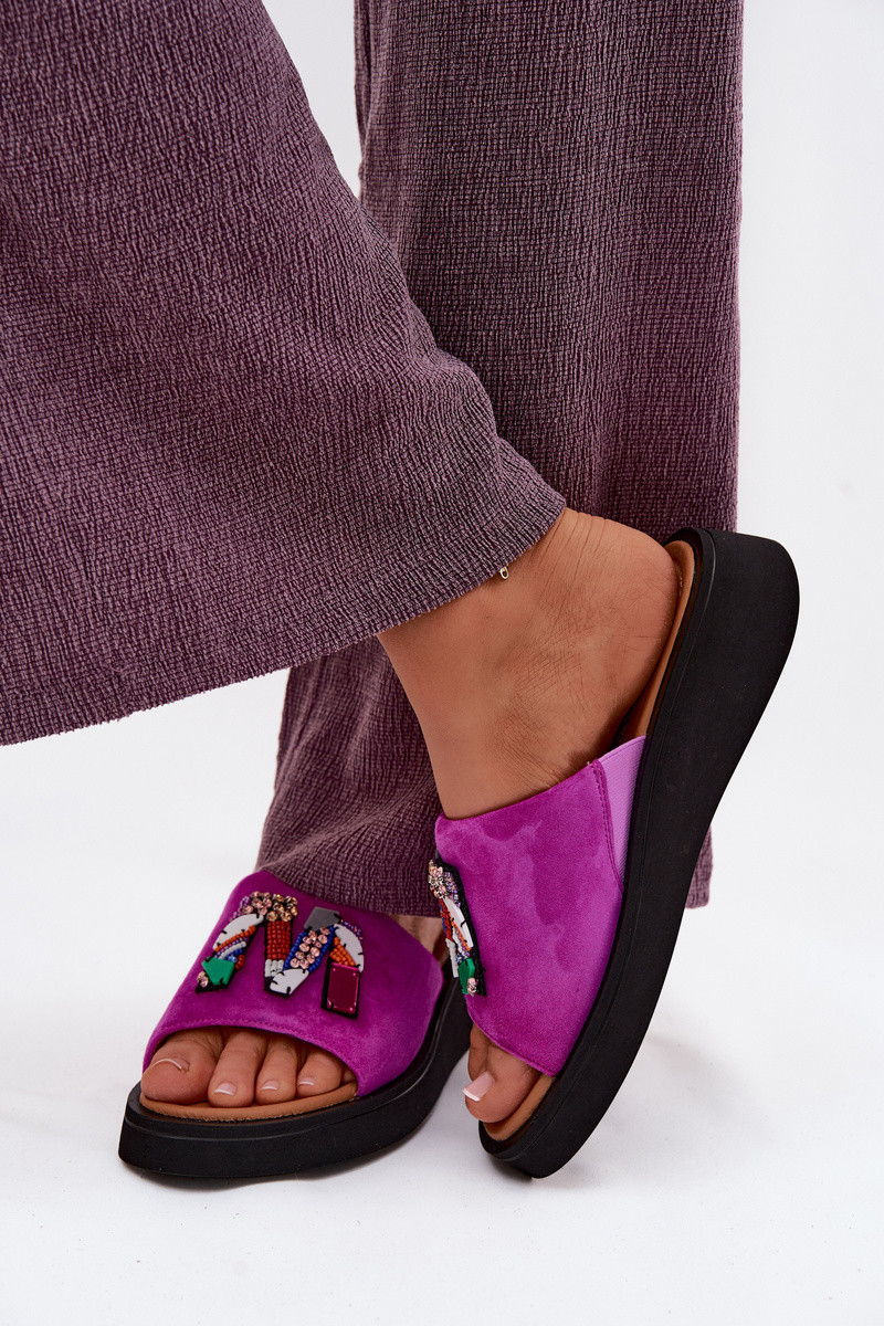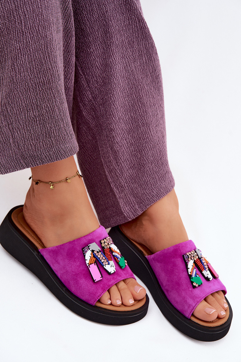 VINCEZALeer Dames suède pantoffels met ornamenten met platform Vinceza 66942 roze