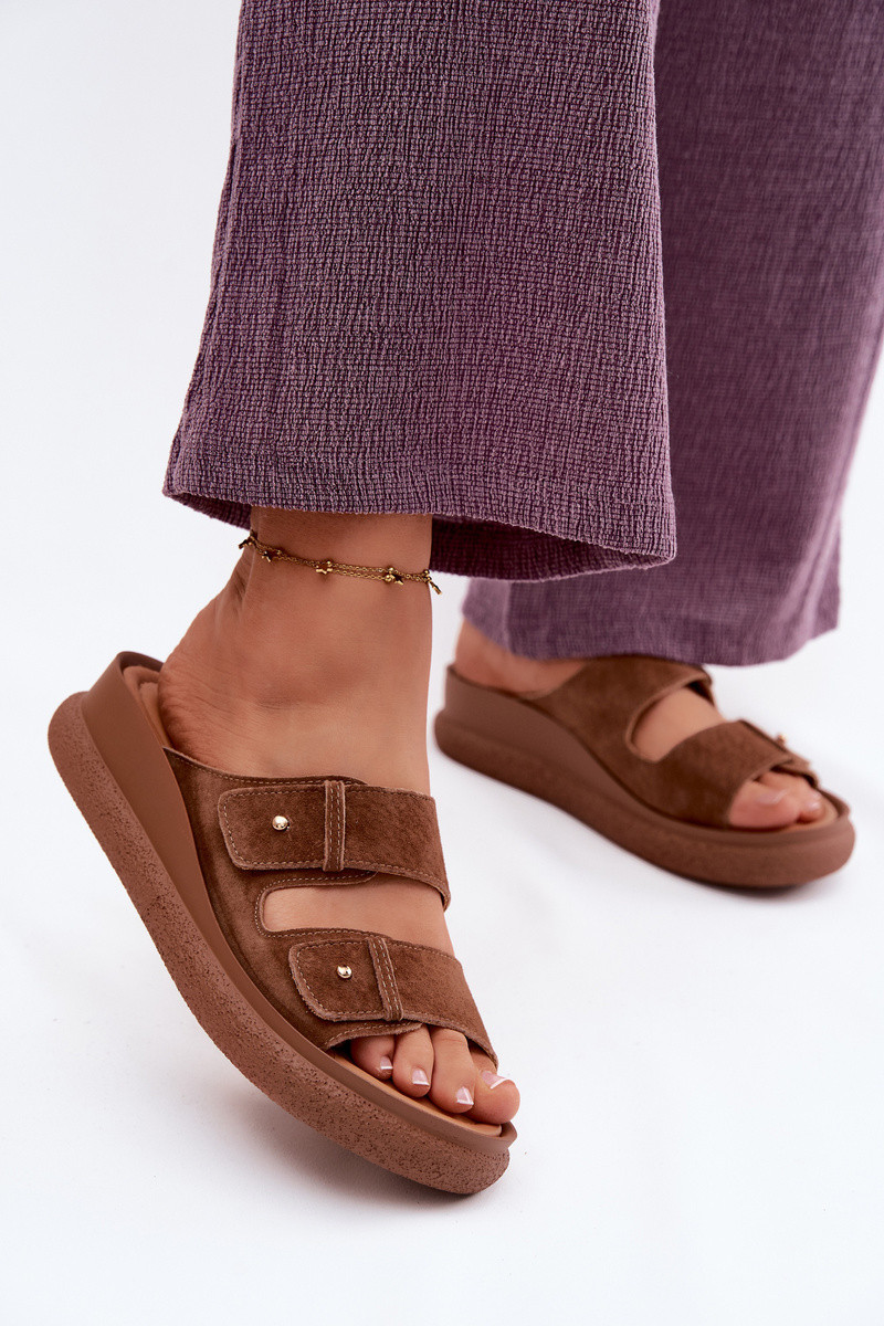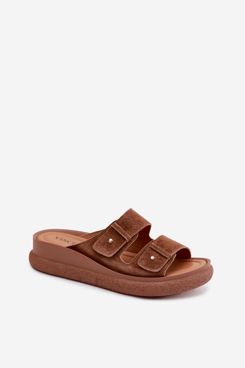 Leer Dames suède pantoffels met platform Vinceza 66916 bruine kleur
