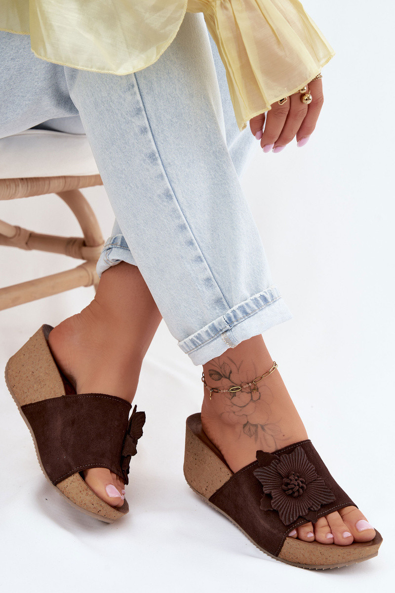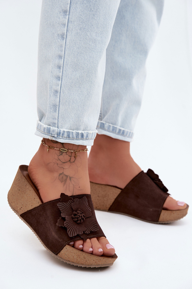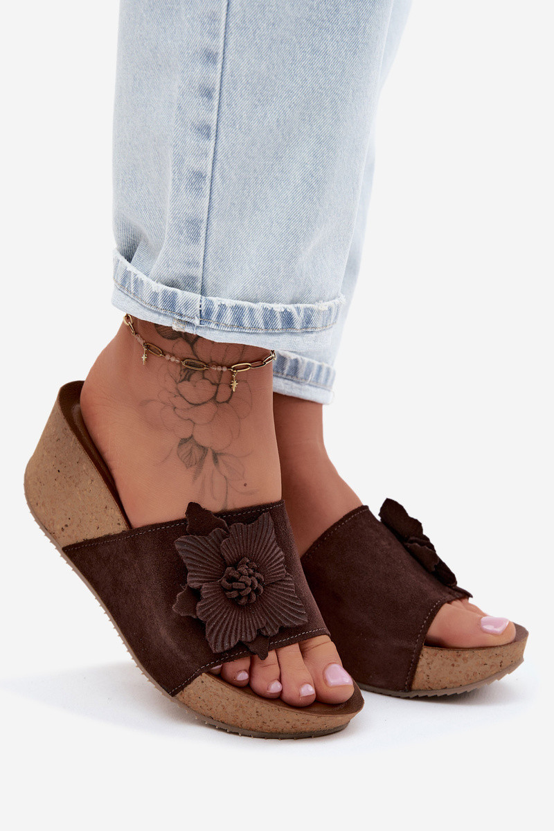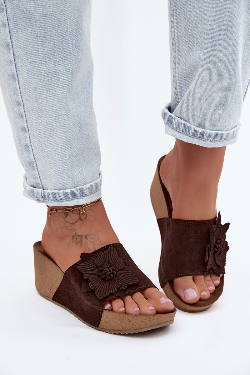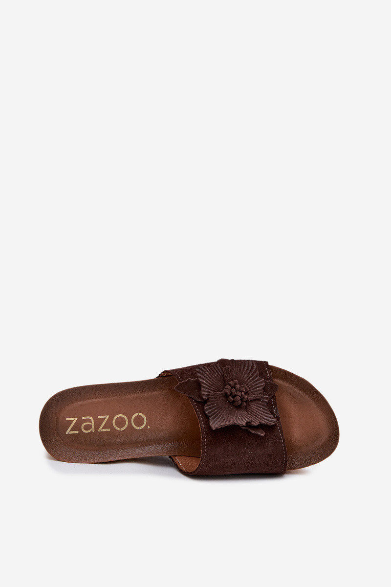 Zazoo 40312 chocoladekleurige suède slippers met platform en decoratieve bloemenornamenten