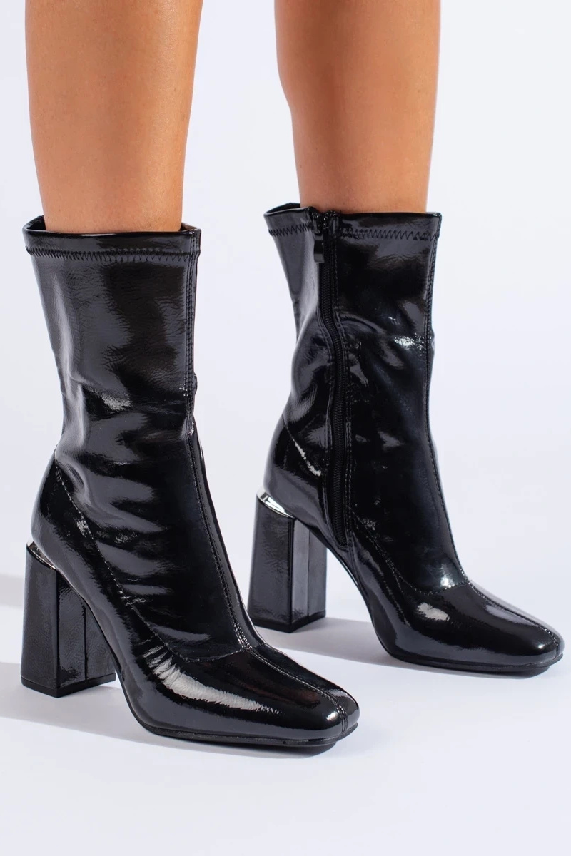 Hoge dameslaarzen op hakken gemaakt van lak kunstleer