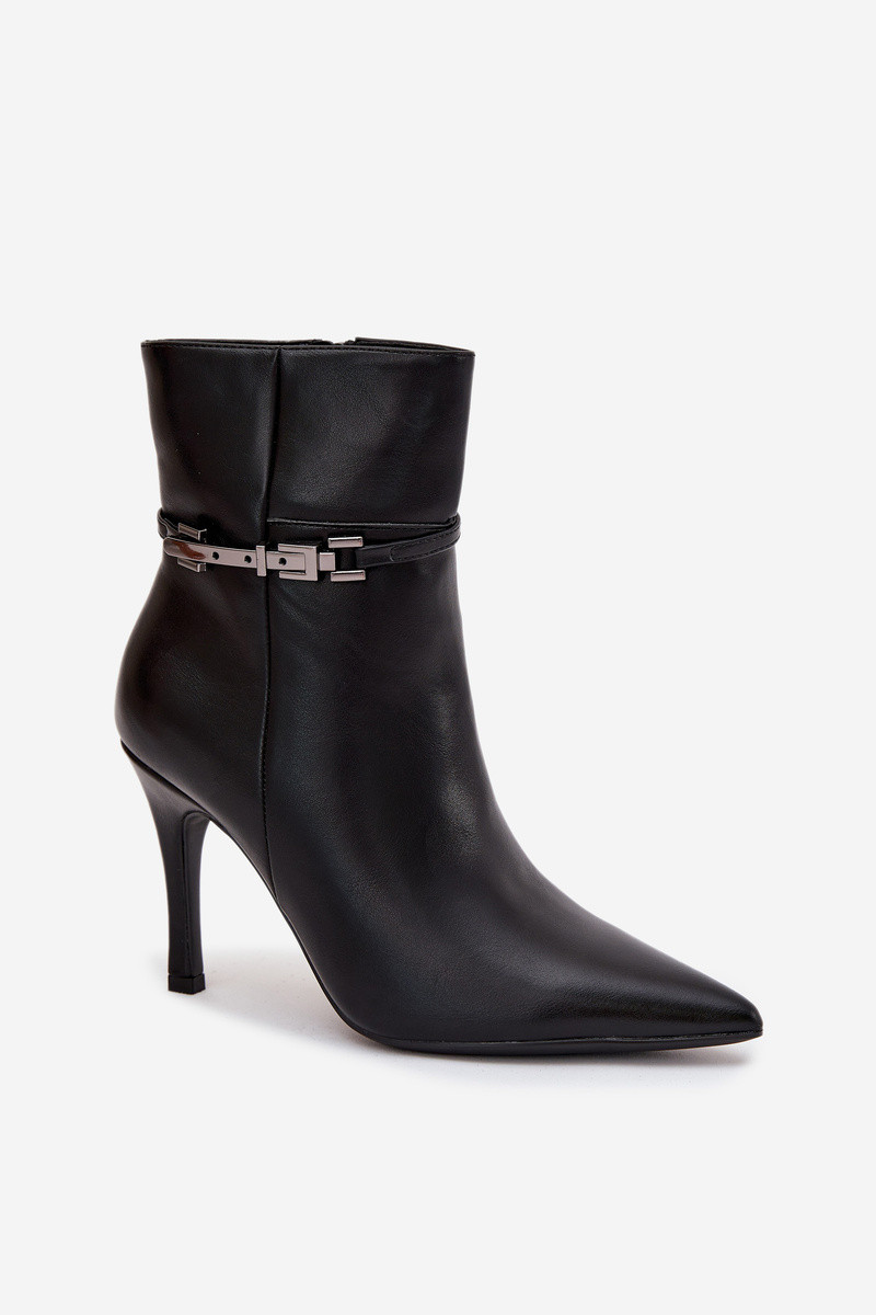 Zwarte gevoerde dames enkellaarsjes met dunne hakken, bandjes en zilveren elementen „Bellisse"