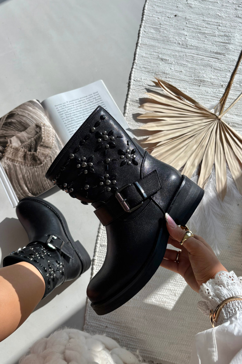 Versierde dames enkellaarsjes met gespen in zwarte kleur Mivana