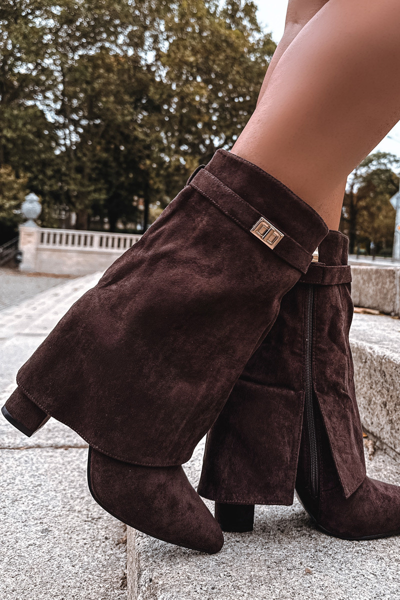 Gevoerde dames enkellaarsjes met versierde hakken in chocoladebruin Luvielle