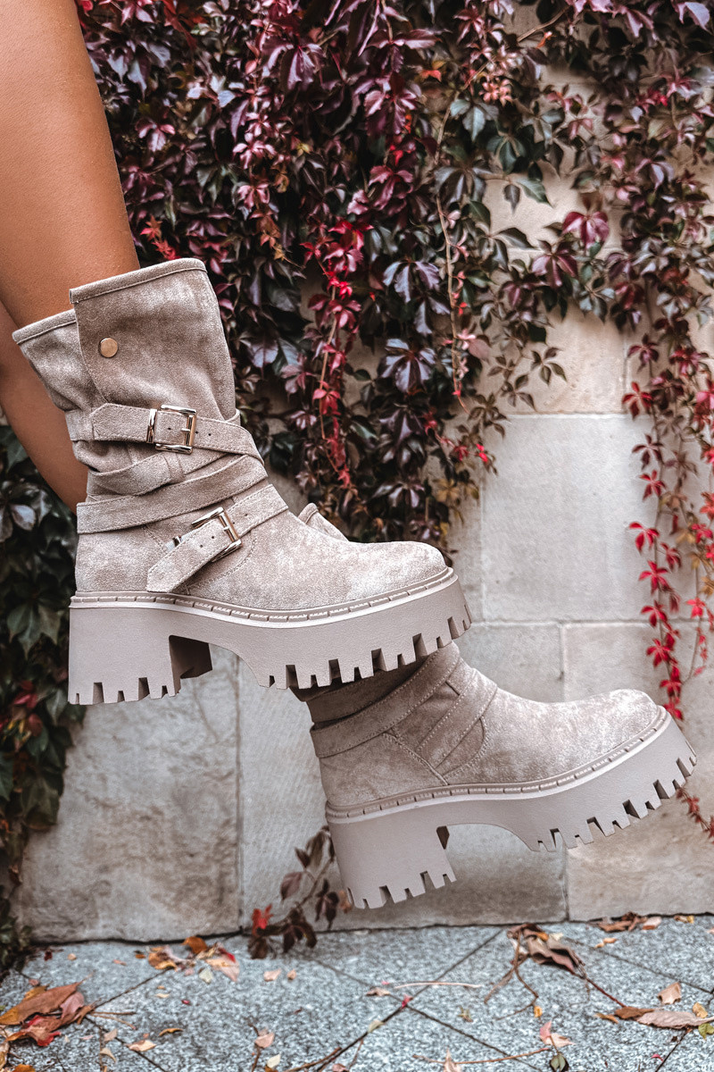 Vrouwelijke enkellaarsjes met grove hakken, gespen en bandjes in zandkleur Nerelisa