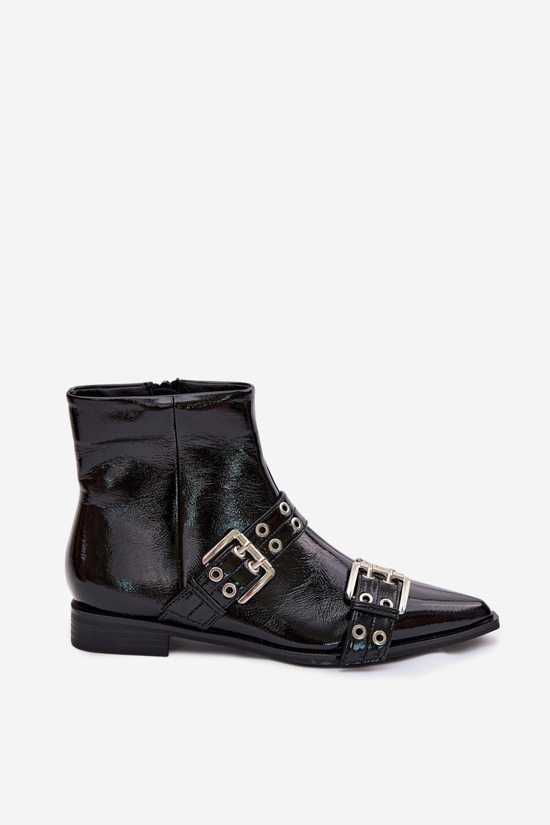 Dames enkellaarsjes met lak-effect en brede hakken met bandjes en gespen zwart Hamira