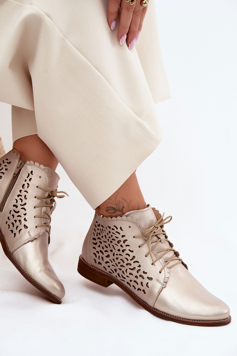 Elegante gouden geperforeerde leren enkellaarsjes met brede hakken Zazoo 4078