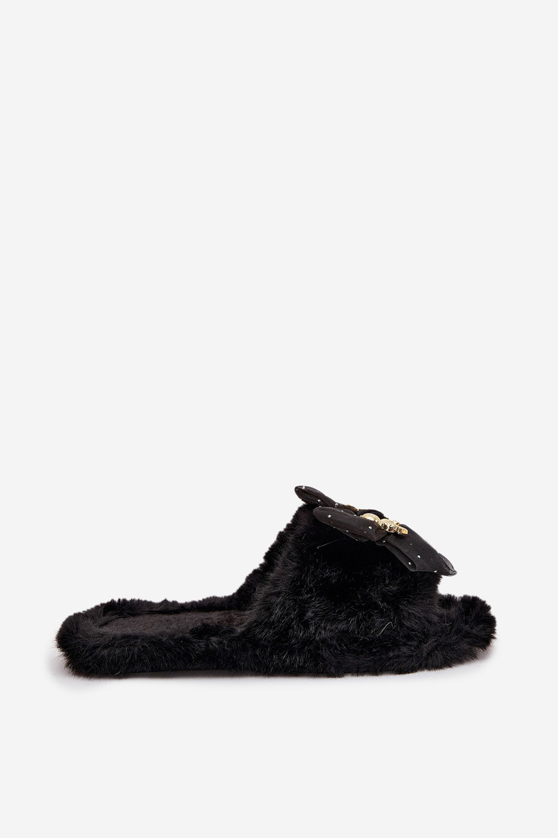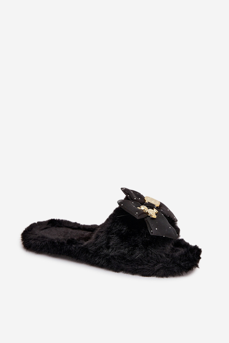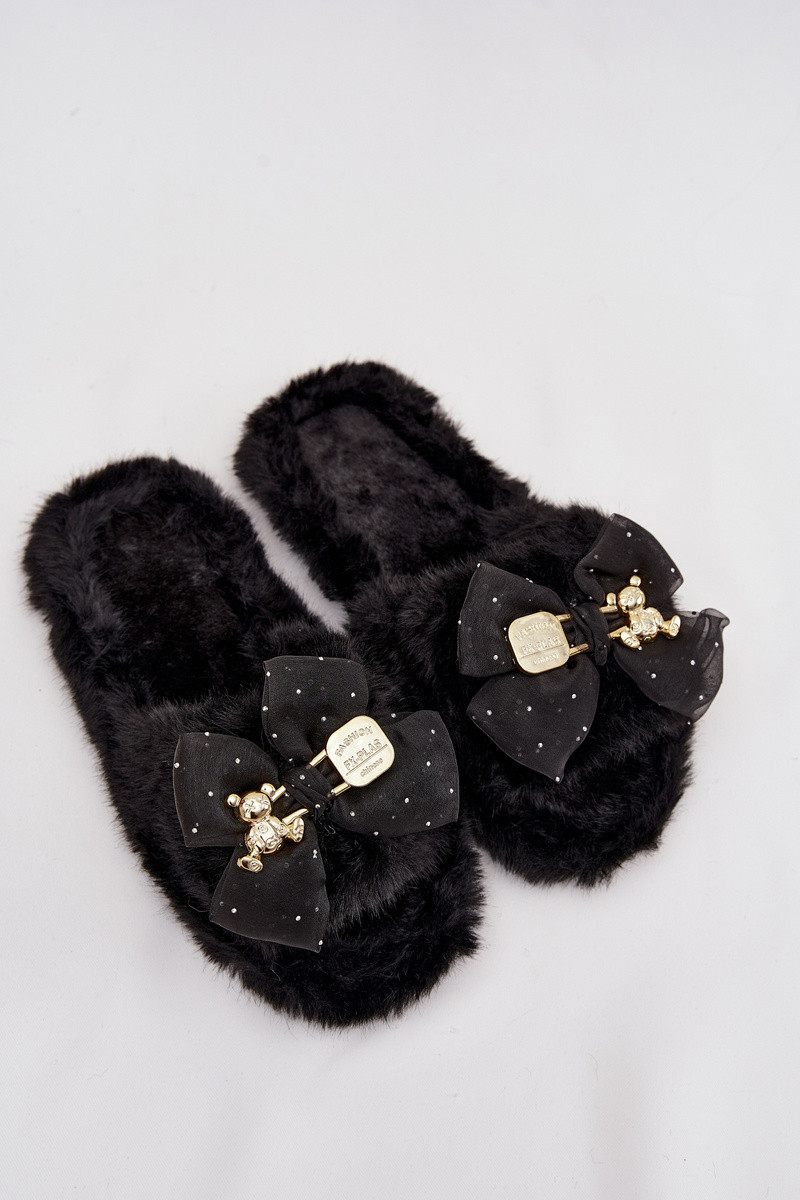 Zwarte dames slippers met bont, strikken en gouden versieringen „Nolara"